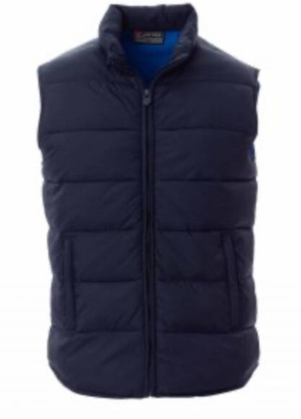 Gilet homme rembourré effet duvet, fermeture éclair en plastique couverte, deux poches extérieures à fermeture éclair couverte, intérieur couleur en contraste.